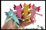 Kids love these bendable flexible axolotl animal characters. They are big sized at 4.75" x 2". They come in 4 different colors. These are adorable little finger fidgets since you can bend and pose the animals into different positions. They also make cute desk pets and collectables making them perfect for classroom prizes, rewards, gifts, and party favors. Fidgets are a self-regulation tool used with children who have a difficult time sitting still or focusing. Fidgets help promote focus and concentration, and keep the body (fingers) busy so they can still sit and focus! Fidget toys are also great for strengthening hand muscles and building fine motor and finger dexterity.