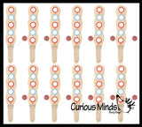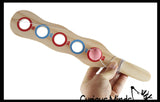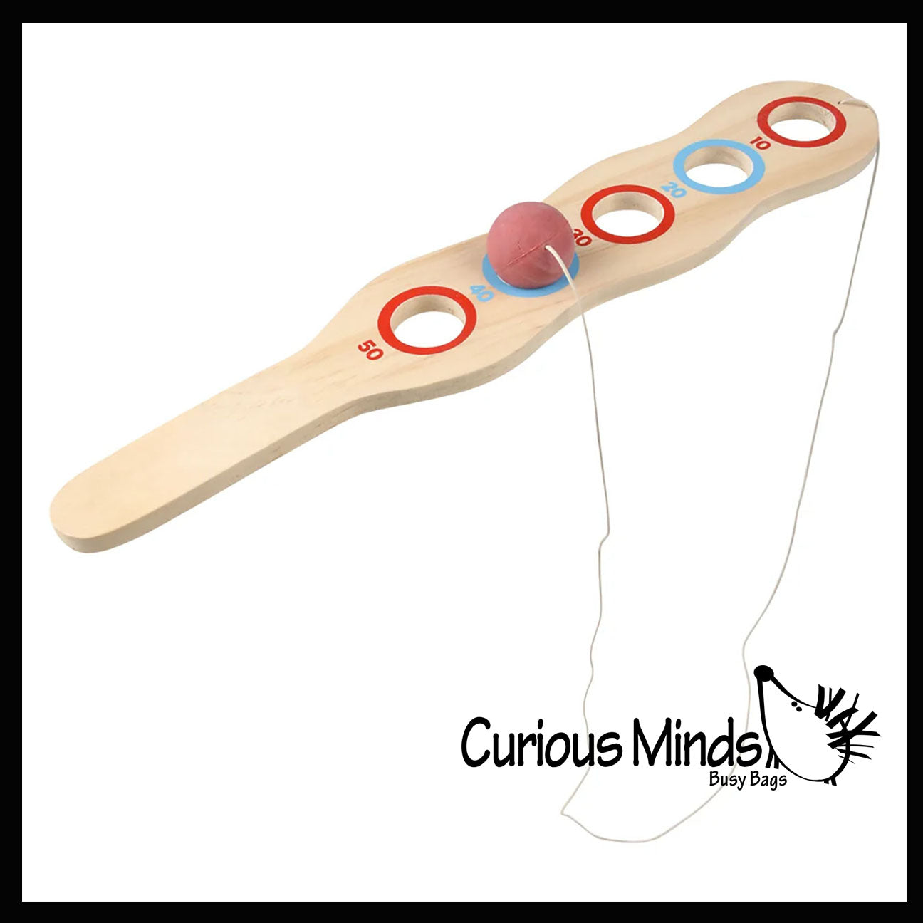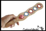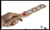 Classic ball and cup toy with a twist. It is a long paddle with 5 holes in it. Each hole is marked with a number score. You swing the attached rubber ball on an elastic string and try to catch it in one of the holes to earn points. Wooden paddle measures 12" long x 2.25" wide, with a 1" ball. You can swing the toy just right to get the ball into the cup! This is a perfect vintage toy that the new generation can enjoy and try to master. Non-electronic toy that keeps the kids minds and bodies moving without a screen. Awesome activity for eye-hand coordination, motor skills, and focus and determination. Easy to take with you! Ages 3+. Packaged in a nice net with hang tag.