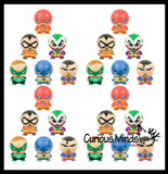 These figurines are capsule toys are of popular DC comic characters. They are unique because the body is inside the capsule head. Pop the head open and take the body out. Snap the 2 pieces of the head together to create the figurine. They are fun for display for collectors and you can store small items in the head. They come in 6 different characters including: Superman, Batman, Robin, Flash, Joker, and Green Lantern. The head is 1.75" and they stand 2.25" tall with the body.