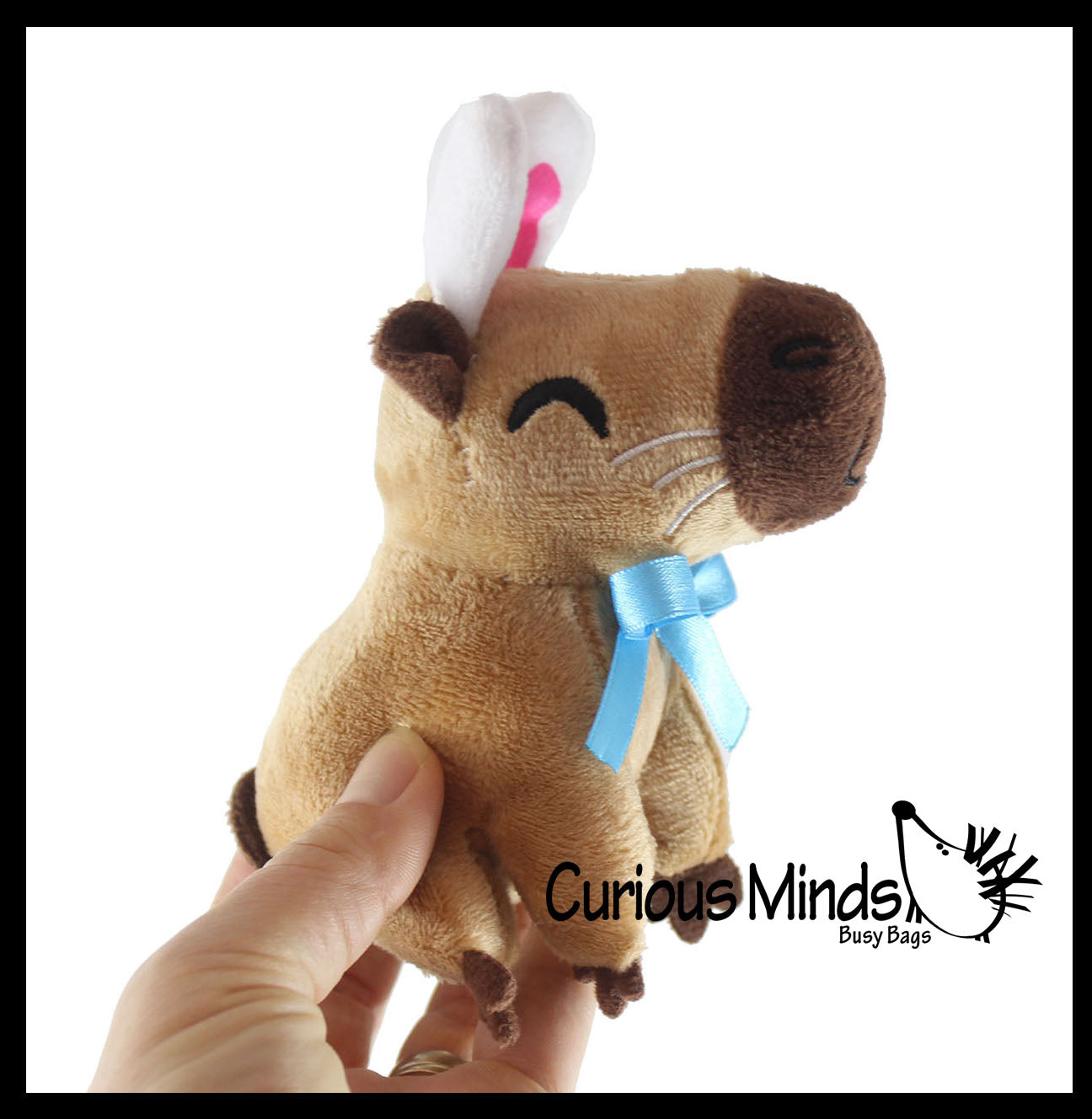 These adorable stuffed animals are small Easter themed plushies! This Capybara is so cute with a little blue bow and bunny ears! The details including eyes and whiskers are sewn on. The plush stands 4" tall (5" with ears), x 4.5" x 2.5".