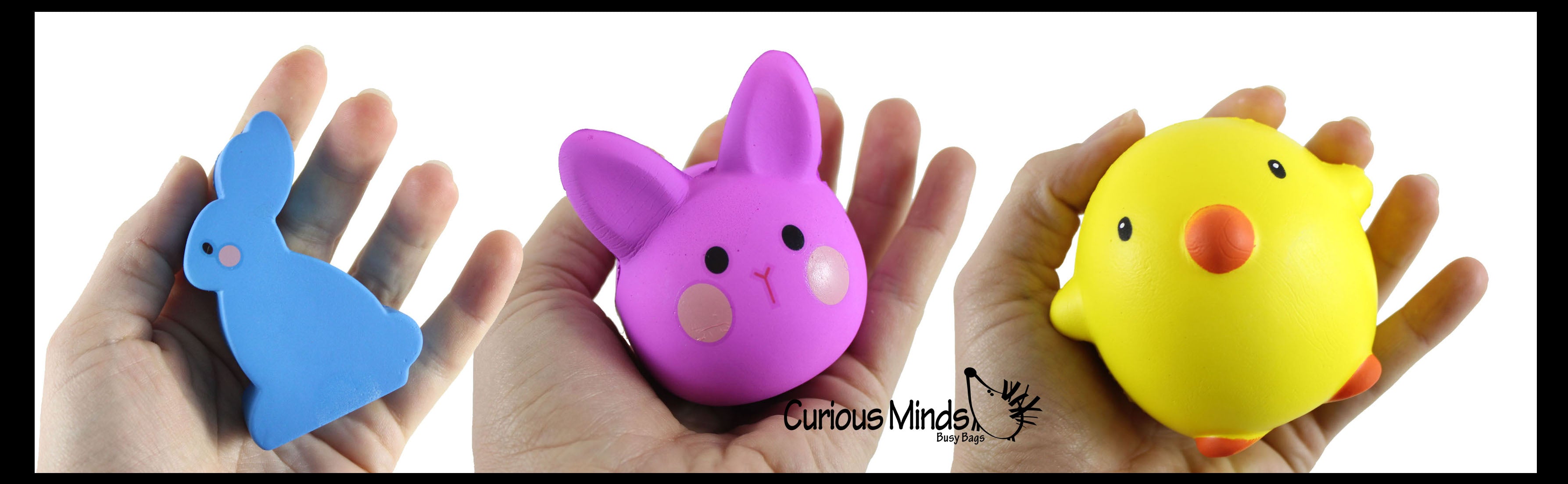 These adorable Easter themed stress toys are ultra soft and squishy. These are the cool slow rise foam squishies. Just squeeze the super soft animal and watch as it slowly comes back to shape. Includes 3 Random color squishies.