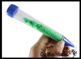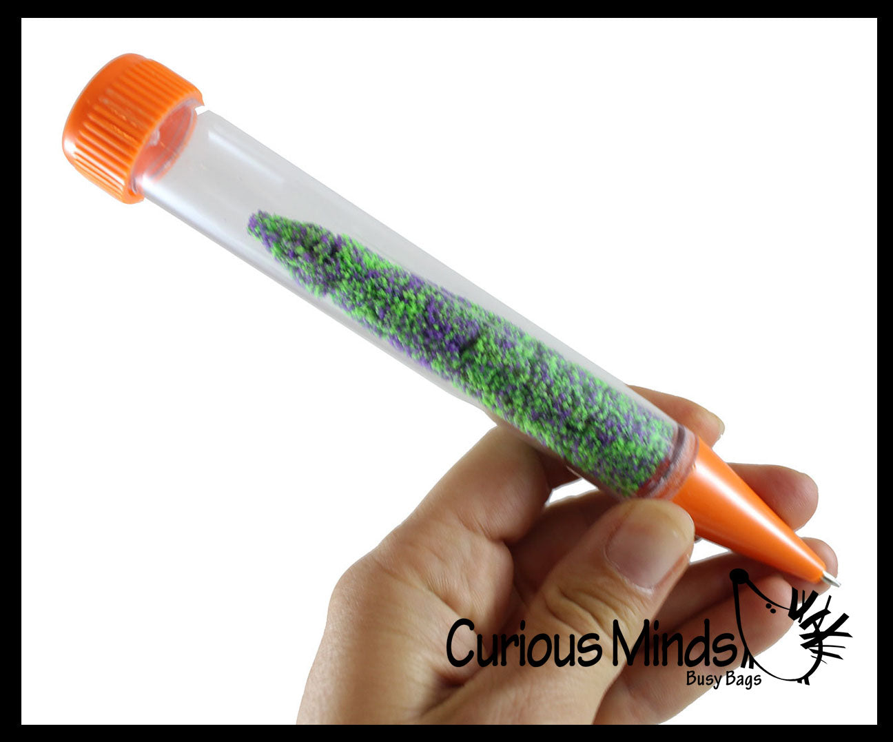 This fidget is a pen and fidget in one! The pen contains an empty capsule that has soft flowing foam compound inside. You can tip the pen to and watch as it slowly falls to the bottom. Tip it again to put it back in motion. This pen is fun to be played with making it a discreet fidget for the school or office. You can also unscrew the cap to play with the compound!
