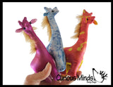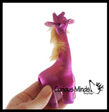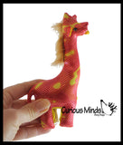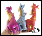 These giraffes are small plush animals that are filled with sand. They are weighted animals for their size making them good tiny little sensory toys that gives compression and self awareness in small areas. The giraffes are wrapped in a shimmery glittery fabric and have such cute detailing making them adorable gifts or decorations on any desk. Since they are heavy and weighted, they make cute bean bags for themed toss games for parties. Giraffes are 6" tall, 2.5" wide, and 1.5" thick. They come in 3 colors.