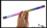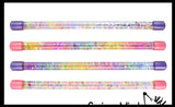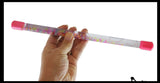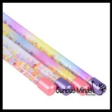 These water glitter batons are fun for pretend play, dance, and as a fidget. The 12" wand is filled with water with glitter and plastic beads inside. When you tip and twirl the stick the glitter and confetti inside slowly moves to the bottom. This is a fun calm down visual fidget.