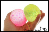This is a very fun stress toy that is not only calming, but it also helps build hand and finger muscles and bilateral coordination. It is beyond amazing and has a super soft dough feel. You can poke and pinch it and it will retain its shape, then slowly ooze back into a ball just like a slow rise squishy would. These are filled with light colored gel and shimmery glitter.