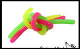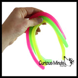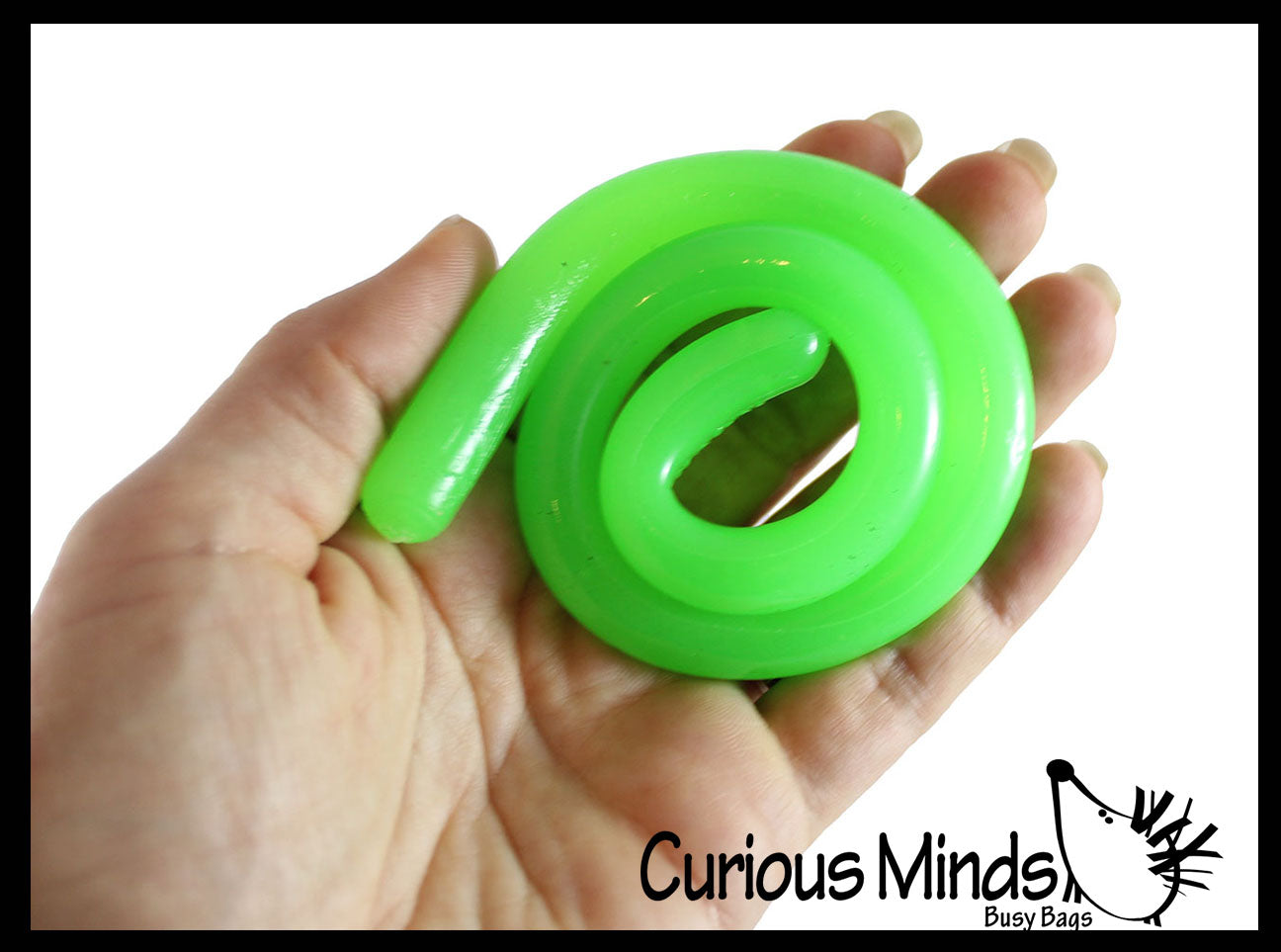 Stretchy String - a super long coiled string that can be stretched out forever (almost) Great for hand strength and bilateral coordination. This stretchy string is approximately 14" long, and can stretch out way further. It is simply a fun fidget to pull and twist while you are trying to focus. These stretchy noodles glow in the dark after they are activated by light! Comes in 3 bright neon colors.