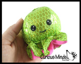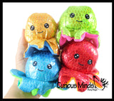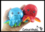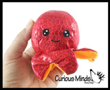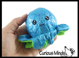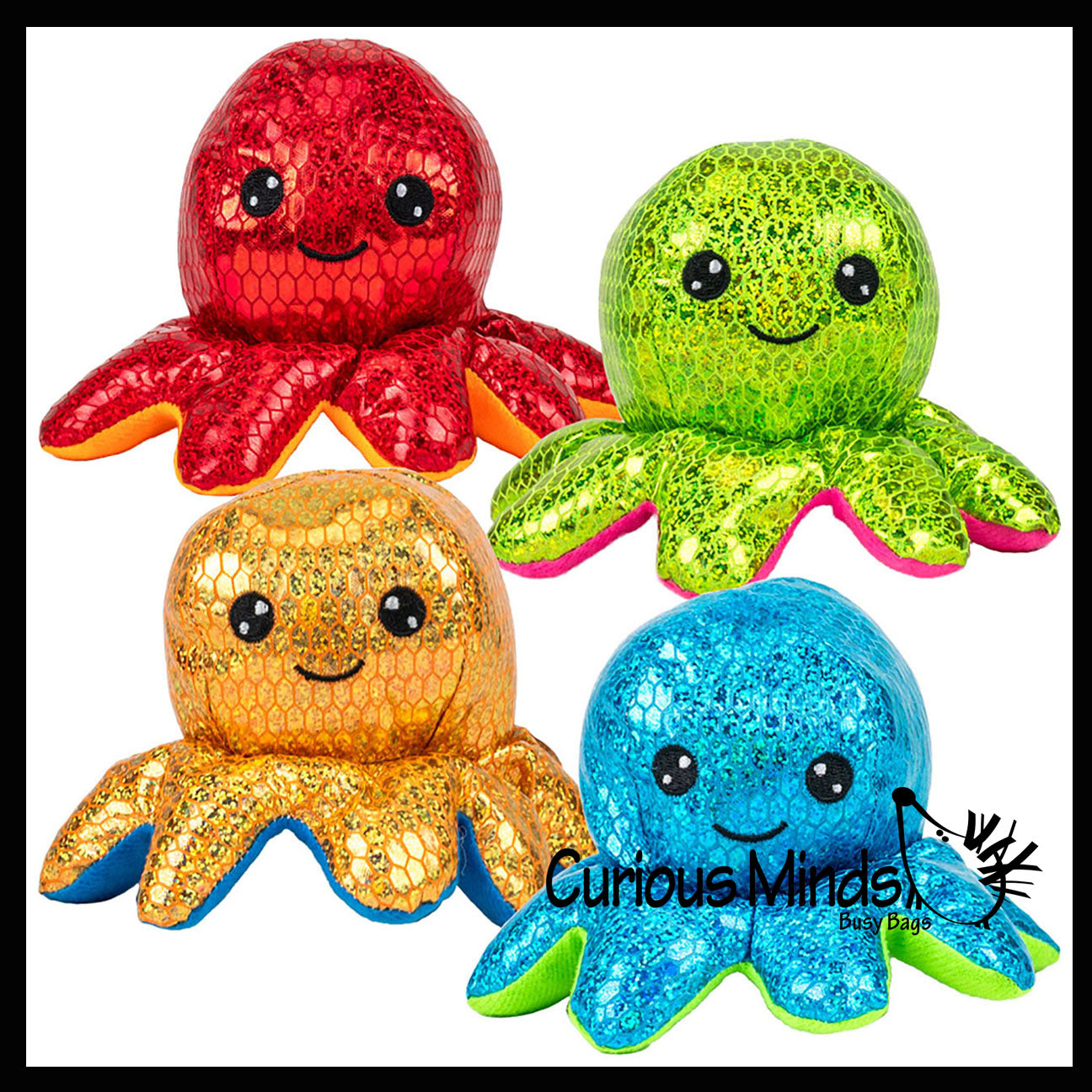 These adorable plush stuffed toys are cute little octopus plush. They come in 4 different color shiny metallic fabrics, with a soft solid color fabric on their underside. The cute mini sized stuffies are 3.5" tall" long and 2.5" wide, making them the perfect size to take along with you, or for carnival prizes, classroom rewards, or party goody bags. These are simply a fun little stuffed animal for kids who like stuffed animals! Small sized and collectable for desks and rooms.
