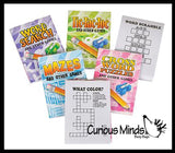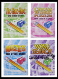 These are tiny little puzzle activity books that are 3" x 2", and contain a mix of favorite puzzle games like mazes, tic-tac-toe, crossword, and word scrambles. NOTE: each book is exactly the same even though there are 4 different style covers. Each book has a mix of puzzles.