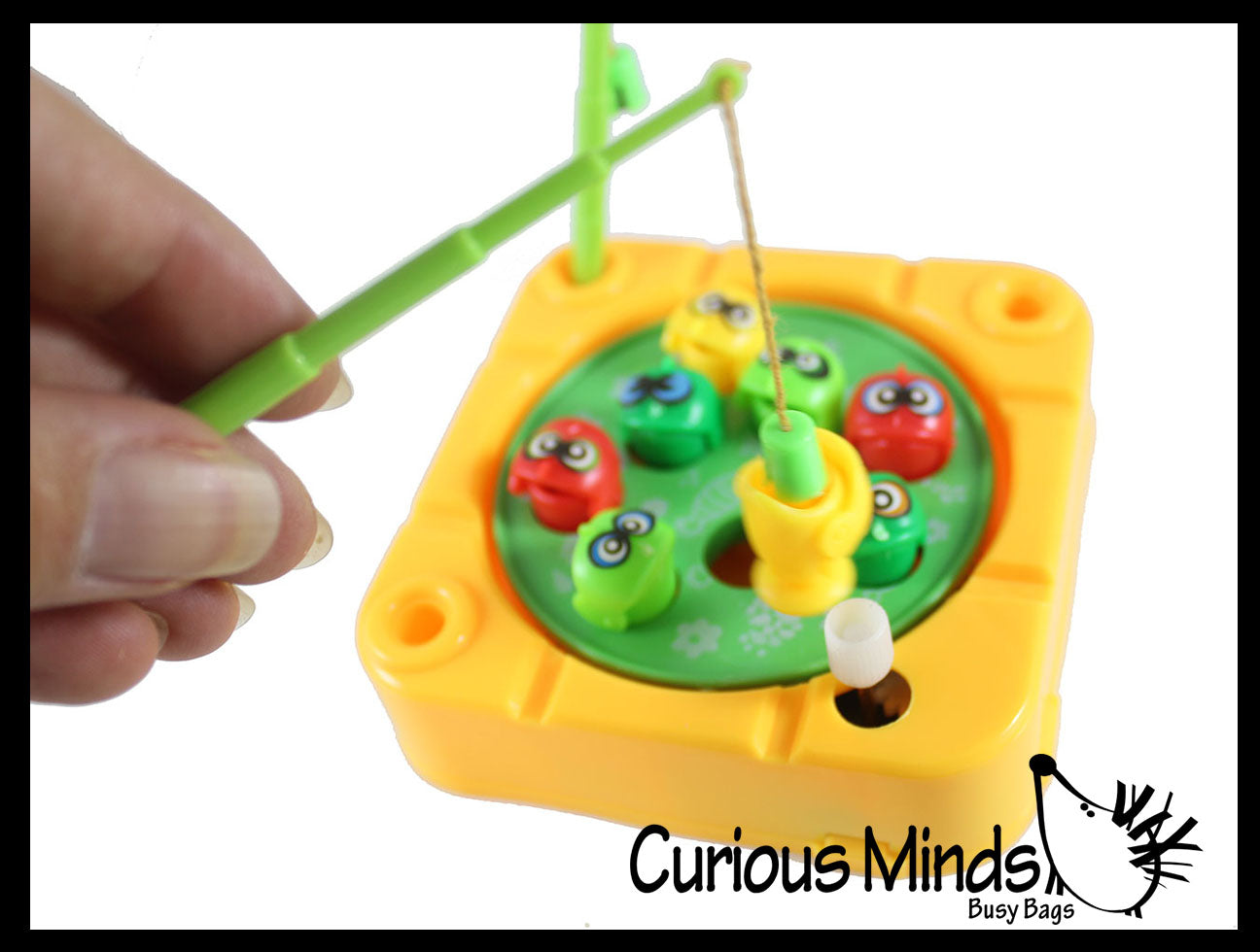 Fishing just got reel fun. This is a mini version of the classic fishing game we played as kids. Wind it up and use one of the 2 magnetic poles to snag a fish. The base slowly turns causing the fish to move and open and close their mouths exposing the magnet inside. Time it right with a steady hand and win the game by catching the most fish. Fish open and close their mouths quickly so a steady hand is required. With 2 fishing poles included (3.5") and 8 fish (1"). Board is 3.5" x 3.5" x 1", and comes in 4 bright colors. Fun twist on a wind up toy and the best part is there are no batteries needed!