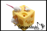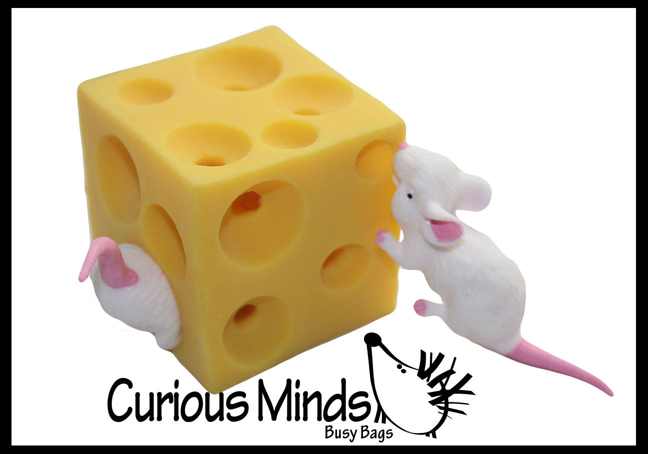 So cute! Comes with 2 mice that can be removed from the cheese and re-positioned anyway you like. Stretch and push them through the holes in the stretchy floppy 2" cheese. Careful though... they might hide from you! Perfect fine motor fidget.