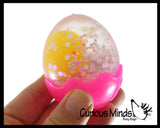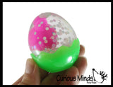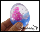 This soothing egg-shaped sensory ball is so cool. The ball is filled with a a clear liquid and glitter inside its flexible skin. Each egg has a colorful animal, either a bunny or chick, inside the egg. Squeeze it to make the animals move inside the egg. The eggs come in 4 colors with different color animals inside. The egg is 2.5" x 2".