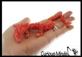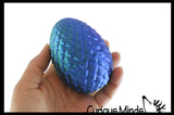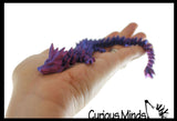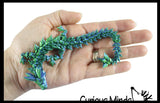 These dragons are a super cool fidget! The critters are made up of 3D printed plastic parts that are connected together. This gives the animal a jointed and robotic movement. You can twist and spin them in your hand. The hard plastic makes a nice sooting sound as the pieces rub together and move. It is quite mesmerizing to feel. Great sensory toy. These are 8" long, and the matching screw together egg is 3.5" x 1.25". These come in 4 cool chameleon colors.