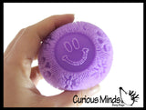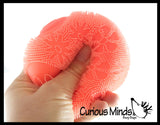 The ball is about 2.75" when it is round, but can be stretched out! This is very calming because it has a very silky soft feel, and it is filled with a thick soft almost fluffy doh that looks like soft serve ice cream. You need to feel it to really know how nice these are.