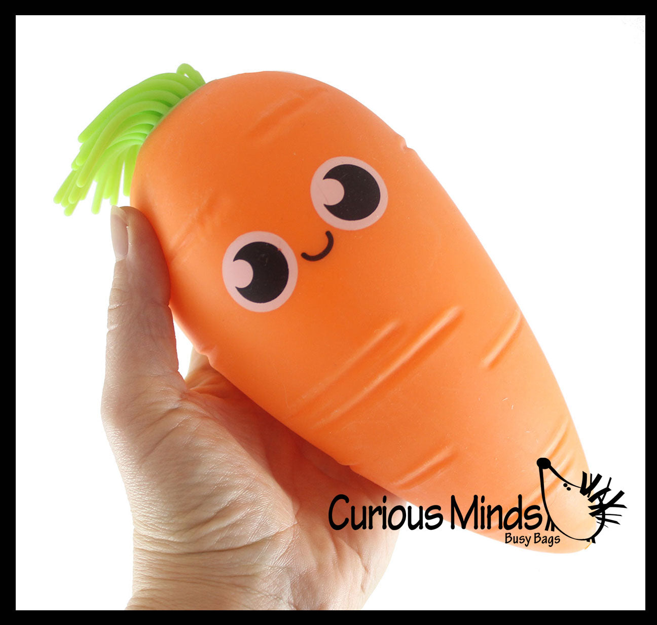 These jumbo carrot shaped puffer balls have soft rubber spikes and a super-stretchy and squeezable texture. When you squeeze these puffer balls, an air bubble emerges from the interior. For ages 3+. The veggie is big measuring 7" x 3.5".