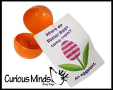 - 12 joke filled eggs - These eggs are pre filled with funny Easter jokes. Each egg has a thick card with a joke on it. Great addition to any Easter basket, egg hunt or party goodie bags! Great no candy alternative and so cute. Eggs are 2.5" x 1.75" and in a mix of 6 colors.