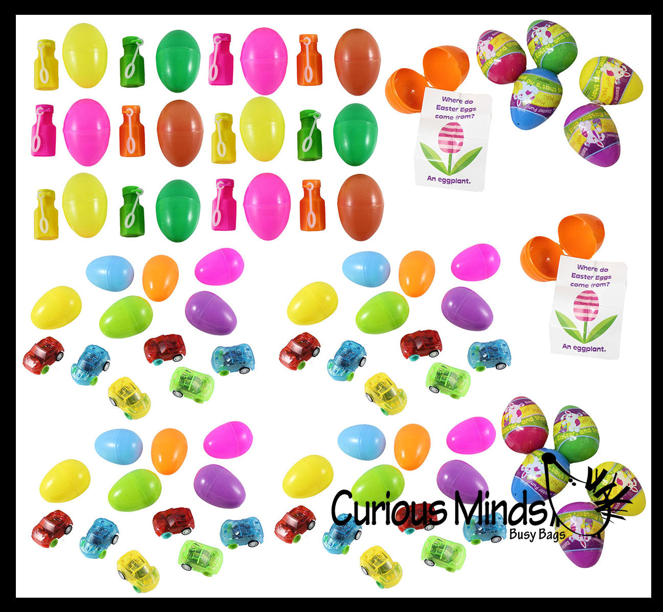 - 24 Pull-back racer cars in eggs - These Easter eggs are filled with little pull back cars that move on their own! Each egg includes one car. These would be great additions to Easter baskets or for an Easter egg hunt, and the best part is they are already filled for you! They are a great no candy alternative and so cute! Eggs are 2.5" x 1.75" each. Cars are 1.75" tall x 1.25" wide.