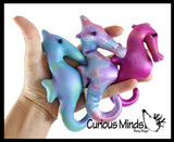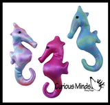 These seahorses are small plush animals that are filled with sand. They are quite weighted animals for their size making them good tiny little sensory toys that gives compression and self awareness in small areas. Each sea horse weighs 4.16oz. The seahorses are wrapped in a shimmery glittery fabric and have such cute detailing making them adorable gifts or decorations on any desk. Since they are heavy and weighted, they make cute bean bags for themed toss games for parties. 3 Color Seahorses are 6" long, 2.75" wide, and 1.25" thick. 4 Color Seahorses are 4.75" x 4" x 1".