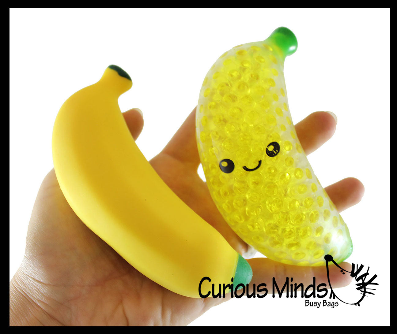 1 Water Bead Banana (Random Face) - This banana is a soothing sensory ball. It is filled with a bunch of thick yellow gel balls inside its flexible skin. When you squeeze the ball the beads push out and around making the ball bulge. It is very soothing to feel the little gel beads, and it also makes a soft swishing sound to add to the sensory experience. The bananas have 4 different style faces, in both boy and girl styles. 5.5" x 2".