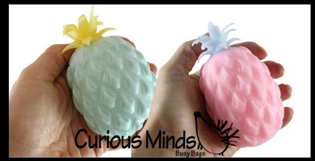2. Water Bead Filled - This large pineapple is a soothing sensory ball. It is filled with a bunch of thick clear gel balls inside its flexible skin. When you squeeze the ball the beads push out and around making the ball bulge. It is very soothing to feel the little gel beads, and it also makes a soft swishing sound to add to the sensory experience. 4" x 2.75" x 2.75". Soft, squishy texture. Ages 5+. Available in 4 pastel colors. Random Color.