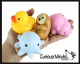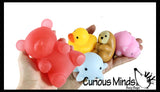 These adorable jiggly critters are large squishy animals. They have a unique, almost gummy feel. The animals are soft yet almost sticky and make a nice small finger fidget. They are tacky enough to place on a desk to discretely poke with fingers and would make nice finger warm up tools. These little guys do pick up lint because of the tacky surface. You can wash then coat with some cornstarch to bring them back. Each animal is individually wrapped making them ideal for party favors or prize boxes. Ages 3+.