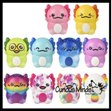 These adorable axolotl themed toys are made from the cool memory foam slow rise squishy material. They are super soft and squishes easily then slowly comes back to its shape. The squishy toys make perfect party favors or prizes Since it is a squeezy toy it makes a fun stress ball and helps build hand strength! Each squishy is individually wrapped. Assortment of 10 different axolotls. They are 3.25" x 2.5" x 2".