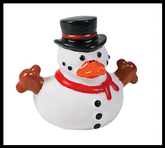 These cute little rubber duckies are dressed up as snowmen! Simply a cute winter novelty toy perfect for party favors or decorations. Fun in stockings and goodie bags or for prize boxes and rewards. Each duck is 2" tall by 2.5" wide from stick arm to stick arm.