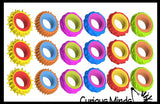 These bright and colorful rings are fun fidget toys that you can wear. Each ring is 1.25", and has a soft, textured silicone skin. The center part of the ring is plastic, and has a spinner so you can spin and twirl the fidget on your finger. These are a nice quiet and discrete fidget that is easy to take with you or use in the classroom or office.