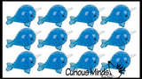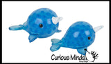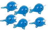 This cute narwhals are a soothing sensory ball. It is filled with a bunch of thick gel balls inside its flexible skin. When you squeeze the ball the beads push out and around making the ball bulge. It is very soothing to feel the little gel beads, and it also makes a soft swishing sound to add to the sensory experience. Narwhal is 2.75" long (3.5" with horn) x 2.5" wide with fins.