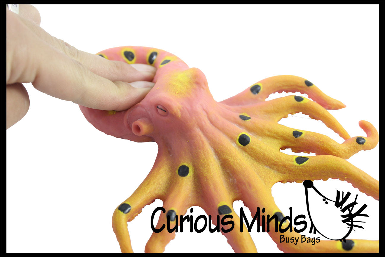 Fun stretchy octopus toy. The soft and pliable body can be stretched far. These large octopi are a perfect squishy sensory stress ball for kids! Each critter is approximately 7.5" long, and are made of a thick skin that has a slightly tacky feel, but it's not sticky. Each octopus can be squeezed and stretched! The octopus is weighted and has little granular balls in the head that add to the sensory experience. The little balls make a quiet crunch like sound when they are squeezed.