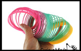 This cute plastic magic spring toy is colored with bright rainbow colors. It measures 3" wide by 2.25" tall unstretched. This magic coil spring is fun for holding and letting it drop to the floor, and fidget in your hands. These are just a fun and calming fidget. Hold one end of the coil in each hand and slowly move each hand up an1d down and watch the coil form a rainbow that moves back and forth. This is also a perfect toy for calming and self regulation. It makes a mesmerizing sound as it falls back and forth. Keep hands busy! Each in a box.