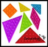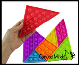This fidget toy is 7 separate shaped bubble poppers that connect to make a 8" shape that is loaded with soft pop-able bubble buttons. You can poke and pop the bubbles multiple times making it a perfect fidget. Each shape is made of a soft and flexible silicone that has 4-17 bubbles for a total of 68 bubbles. Poke the bubbles down and hear a little pop. Turn it over and pop it again! This fidget is a perfect never-ending game of bubble wrap! It is an easy fidget to take with you to school, work, or even in the car or airplane. You can arrange the individual pieces to make a square or hundreds of different shapes like a tangram puzzle game. The largest triangles are 5.5" x 5.5" x 8", and the smallest one is 2.5" x 2.5" x 3.75".