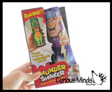 This thunder shaker toy is a tin noisy toy. The shaker is simply a tin tube that has a long metal coil string connected to it. When you shake it, the coil moves and vibrates causing a loud rumbling sound. The tin tube is 6.5" x 2", and the coil is 17" long. The noisemaker toy comes in 3 styles: Hero, yeti, and dragon.
