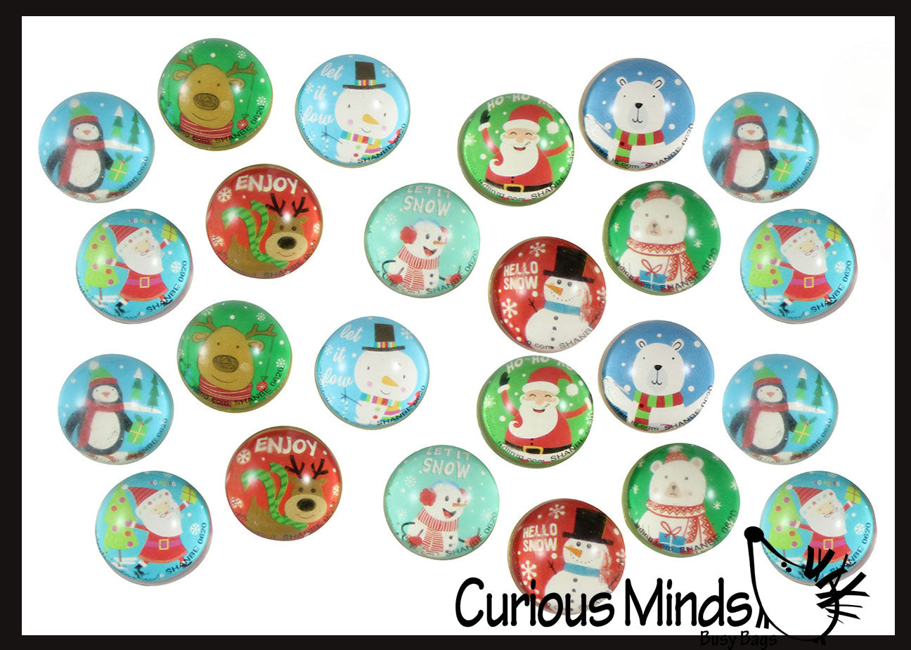 Bouncy balls are a timeless classic toy that every child loves. This set of bouncy balls feature winter holiday and Christmas designs. Themes include: Santa, and reindeer in addition to cold and frozen winter themes such as snowmen, polar bears and penguins. The super bouncy balls are 1.25" in diameter, and they are clear with the festive holiday insert on the inside.