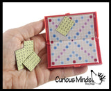 The Scrabble game is 3", and has magnetic letter tiles that actually sticks to the board so you can play a real game. The folding board even has a little drawer to store the tiles.