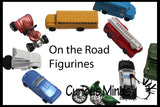 ***** Transportation On The Road Set includes 9 miniature transportation vehicles. (approx 1-2" long) Please note that the vehicles are mini replicas and they have non functioning wheels. School bus, delivery truck, pickup truck, ATV, dirt bike, semi, police car, car (vehicle), and fire truck.