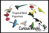 ***** Tropical Bird Animal Set includes: White Ibis, Parakeet, Green Parrot, Flamingo, Keel-Billed Toucan, Cockatoo, Hummingbird, Quetzal, Yellow Macaw, and Snowy Owl.