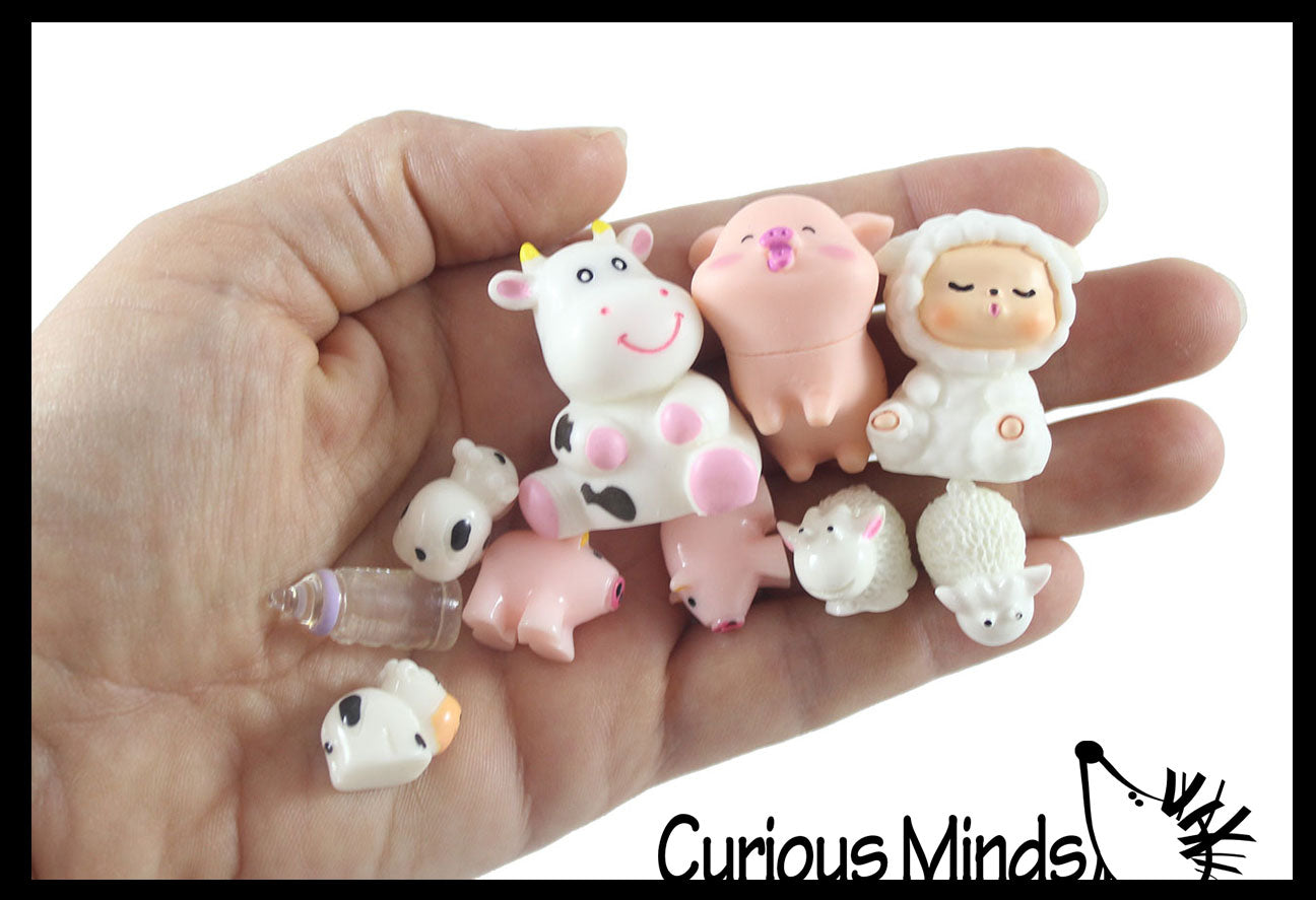 The Surprise farm barnyard Ball to find 3 Adorable mom farm animals, 6 baby animals and 1 baby bottle. Big animals (pig, sheep, cow) are 1.5" x 1.25" and the babies are .75" x .5".