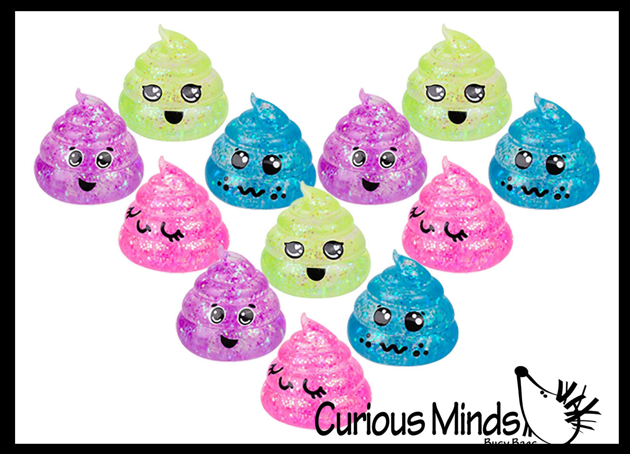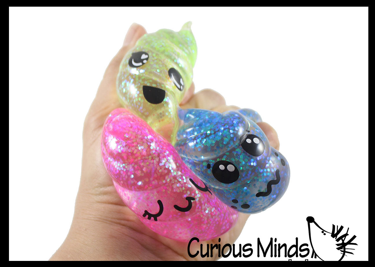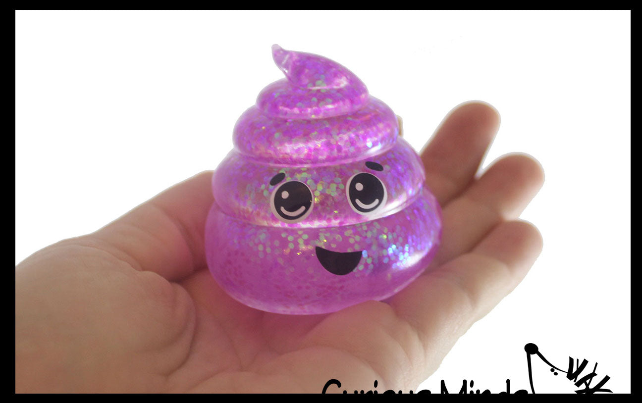 The poop shape style of the sugar ball is so fun to play with. These soft and flexible toys look like little piles of poo. These little toys can be stretched gently. Turds are 2.5" tall, 2" long, and 2" thick and is wrapped in clear plastic. The poop comes in 4 different colors with sparkly glitter inside including blue, green, pink, and purple. This is a very fun stress toy that is not only calming, but it also helps build hand and finger muscles and bilateral coordination. It is beyond amazing and has a super soft dough feel. You can poke and pinch it and it will retain its shape, then slowly ooze back into a cube just like a slow rise squishy would.