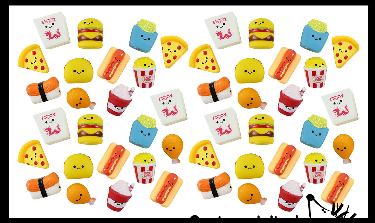 Kids love these little fast food shaped collectable characters. They are about 2" tall and 1.5" wide. The junk foods come in a selection of take out Chinese boxes, burgers, fries, hot dogs, pizza, sushi, taco, popcorn, milkshakes, and drumsticks. These adorable figurines make great birthday goodie bag fillers or popular treasure box prizes or classroom rewards. Hard plastic and hollow.