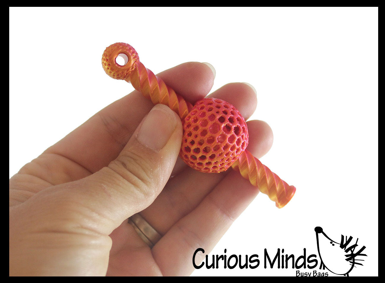 This fidget is a 3D printed spinning moving fidget toy. It is basically a spiral grooved stick with a ball bead. When you tip the stick, the ball follows the spiral grooved stick spinning down. Tip over and over. Stick has a hole so you could put it on your keys or a necklace pendant. Item is 3.5" long with a 1" ball.