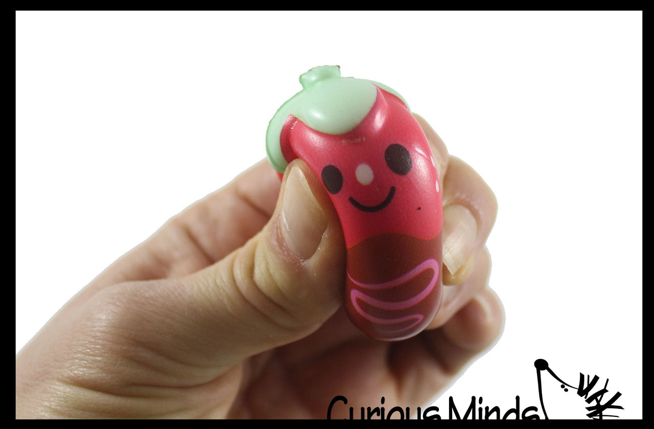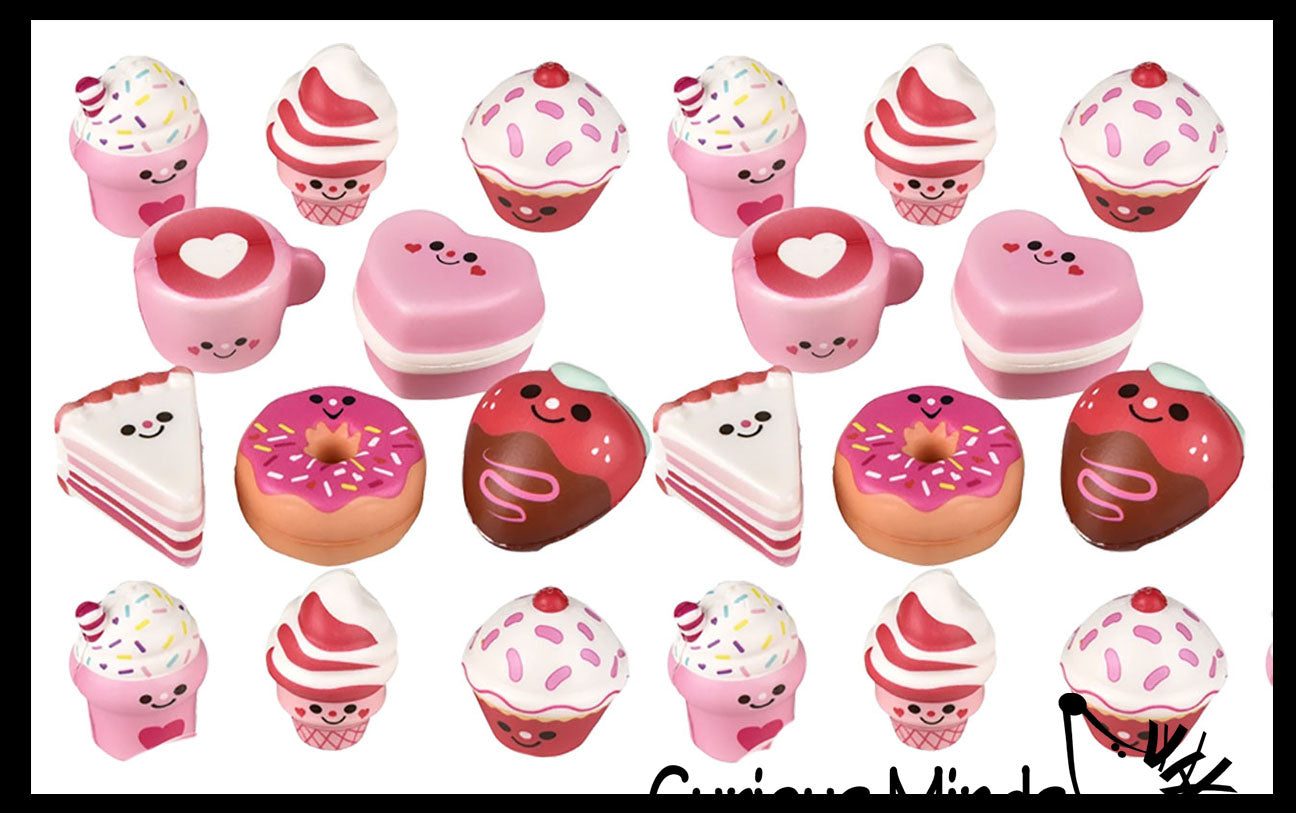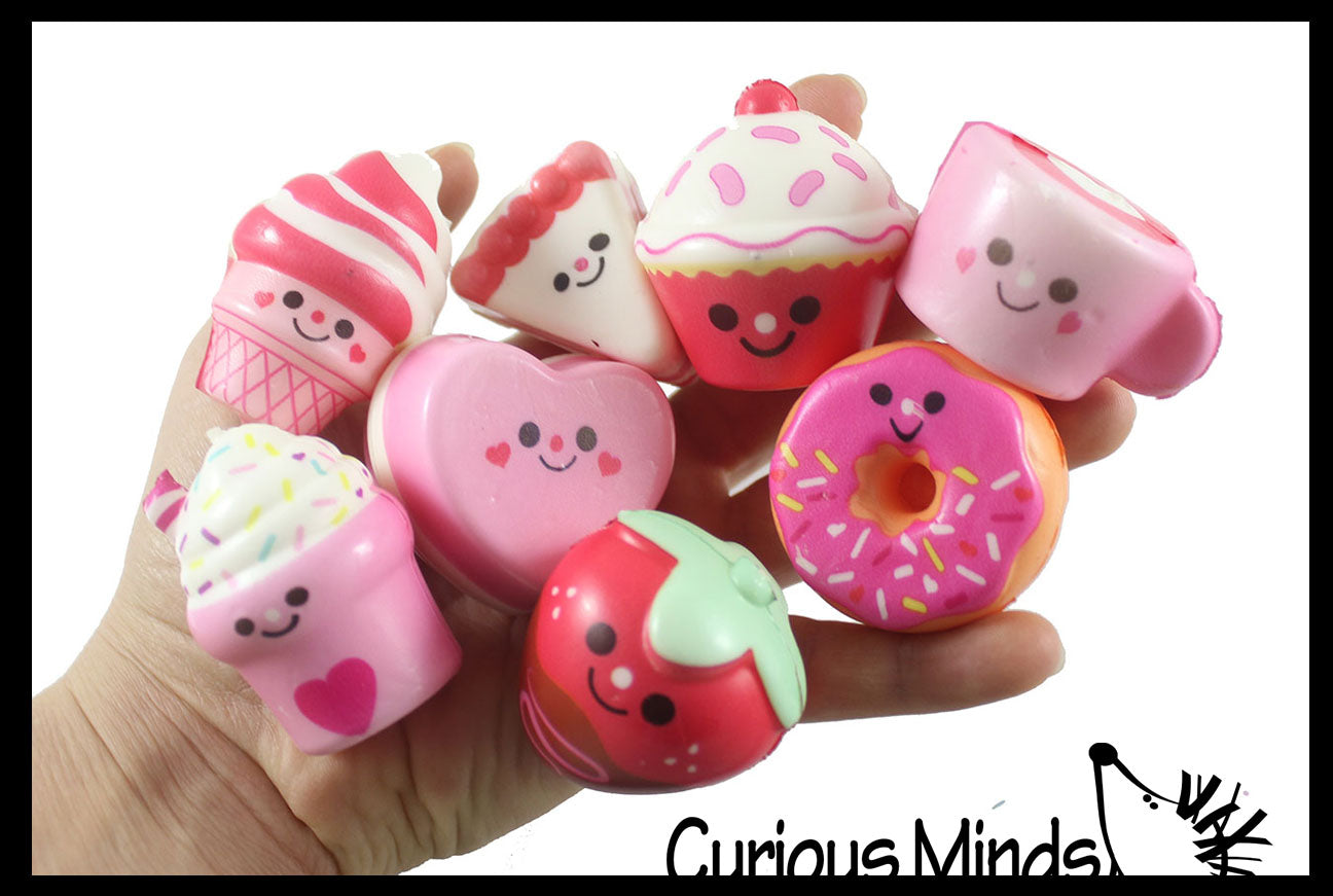 These adorable critters are slow rise squishy Valentines day themed toys. These are small valentines day themed foam toys that when squished, slowly come back into shape like memory foam. Each character is individually wrapped in clear plastic making them ideal for party favors or prize boxes. Use them in place of Valentine's Day cards during a classroom exchange party. Ages 3+. Each animal is approximately 1.75" -2". 8 different heart/love styles include: frappe, ice cream cone, cupcake, coffee, heart macaroon, cake slice, donut, and chocolate covered strawberry.