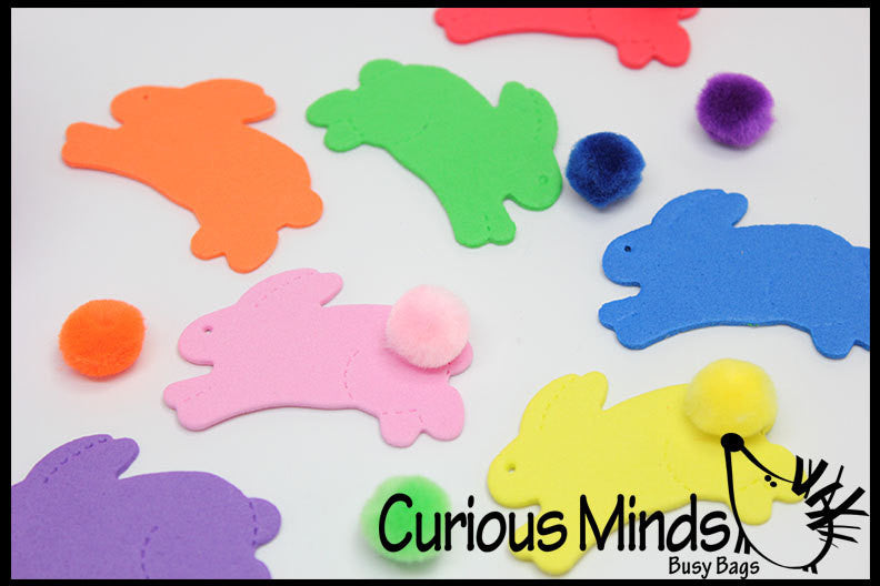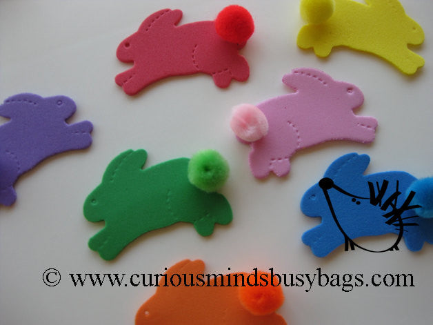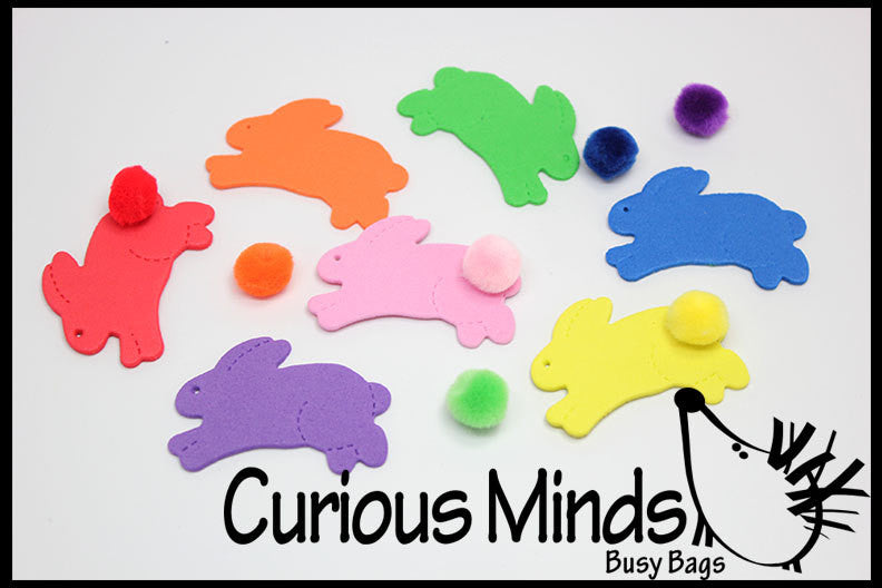Match the tail to the correct color rabbit! You get 7 foam rabbits and 7 matching pom-poms! This is a small and lightweight bag perfect to keep in a diaper bag or purse (each rabbit is about 2.5" long)