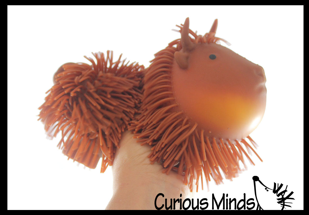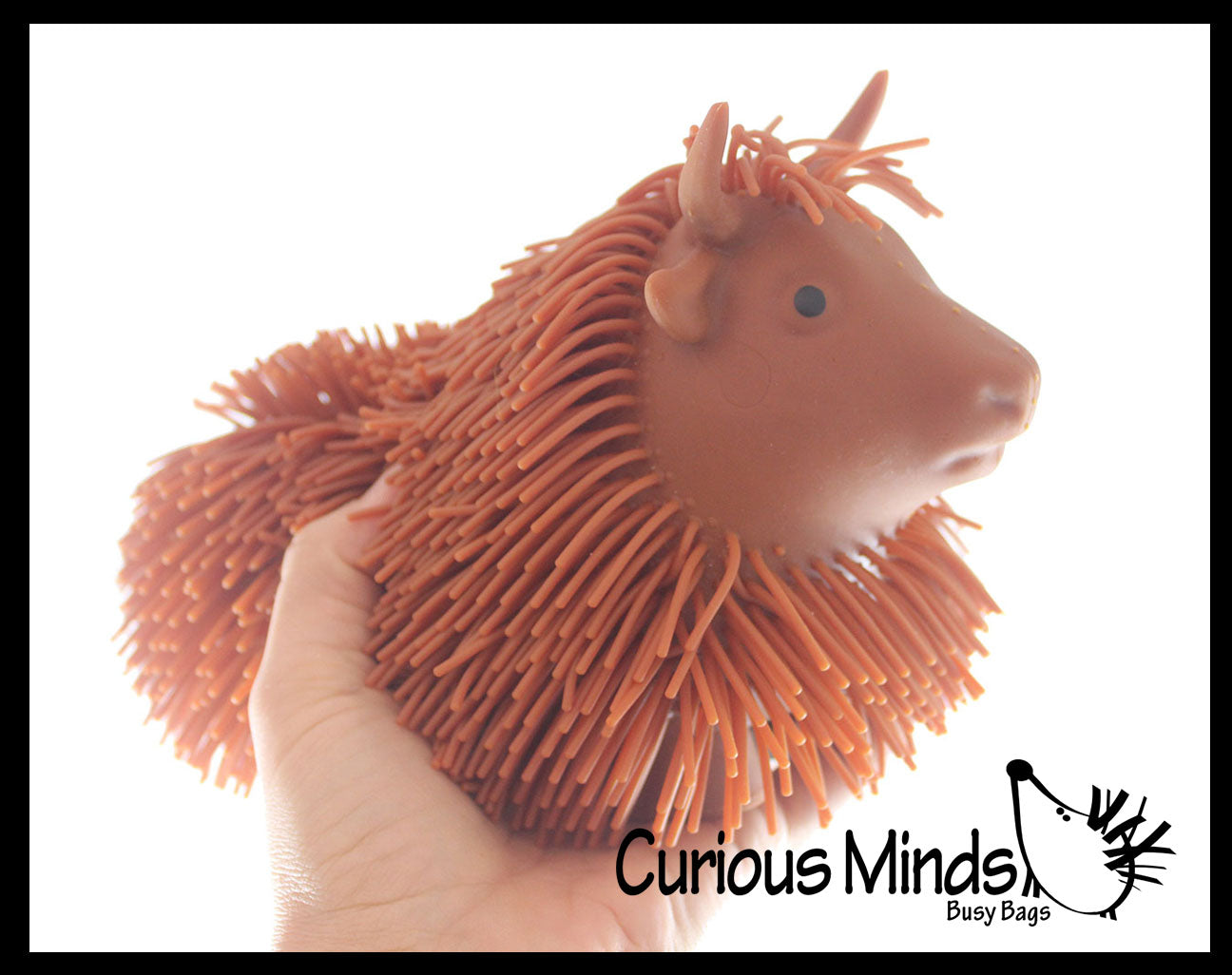 This cow is so cute because it looks like a shaggy hairy highland cow, and the hairs are floppy and fun. This giant puffer ball has soft rubber spikes and a super-squeezable texture. When you squeeze these puffer balls, an air bubble emerges from the interior. For ages 5+. Cows are large and comes in 3 colors.
