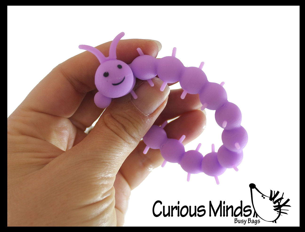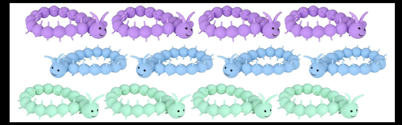 This tactile stretchy assorted caterpillar animal shaped toy is 8" long x .5" thick, and can stretch up to 33 inches. The best part is that this stretchy noodle turns into a bracelet! You can push the head of the caterpillar through the hole in its tail and it will make a wearable fidget. This is a fun fidget for kids who like to pull and stretch. The toy is a soft puffer material that has a soft hairy texture. The adorable insects can be bent and twisted around your fingers, and they even have a cute little faces and feet! Comes in 3 colors.