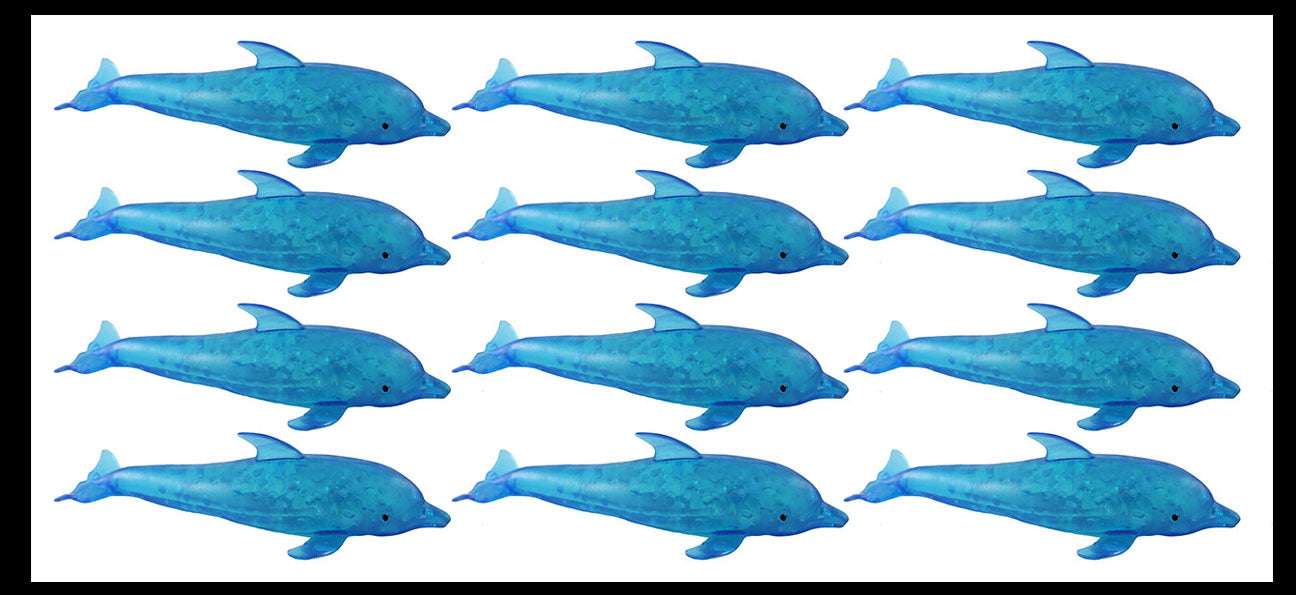 These little dolphins are a pliable squishy soothing sensory ball. Each sea creature is filled with a bunch of thick blue water bead gel balls inside its elastic flexible skin. When you squeeze the dolphin the jelly beads push out and around making the ball bulge. It is very soothing to feel the little gel beads, and it also makes a soft swishing sound to add to the sensory experience.