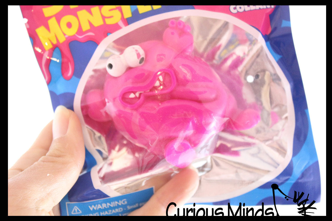 These monsters are a fun water splat toy. Throw it on a wall or the floor and watch it splat flat then slowly come back to life. It also makes a fun stress or fidget ball because it is a water-filled ball that is fun to squeeze and it makes a soothing water splashing sound as you play. The monsters are 3" x 2.5", and come in 3 bright colors, different styles..