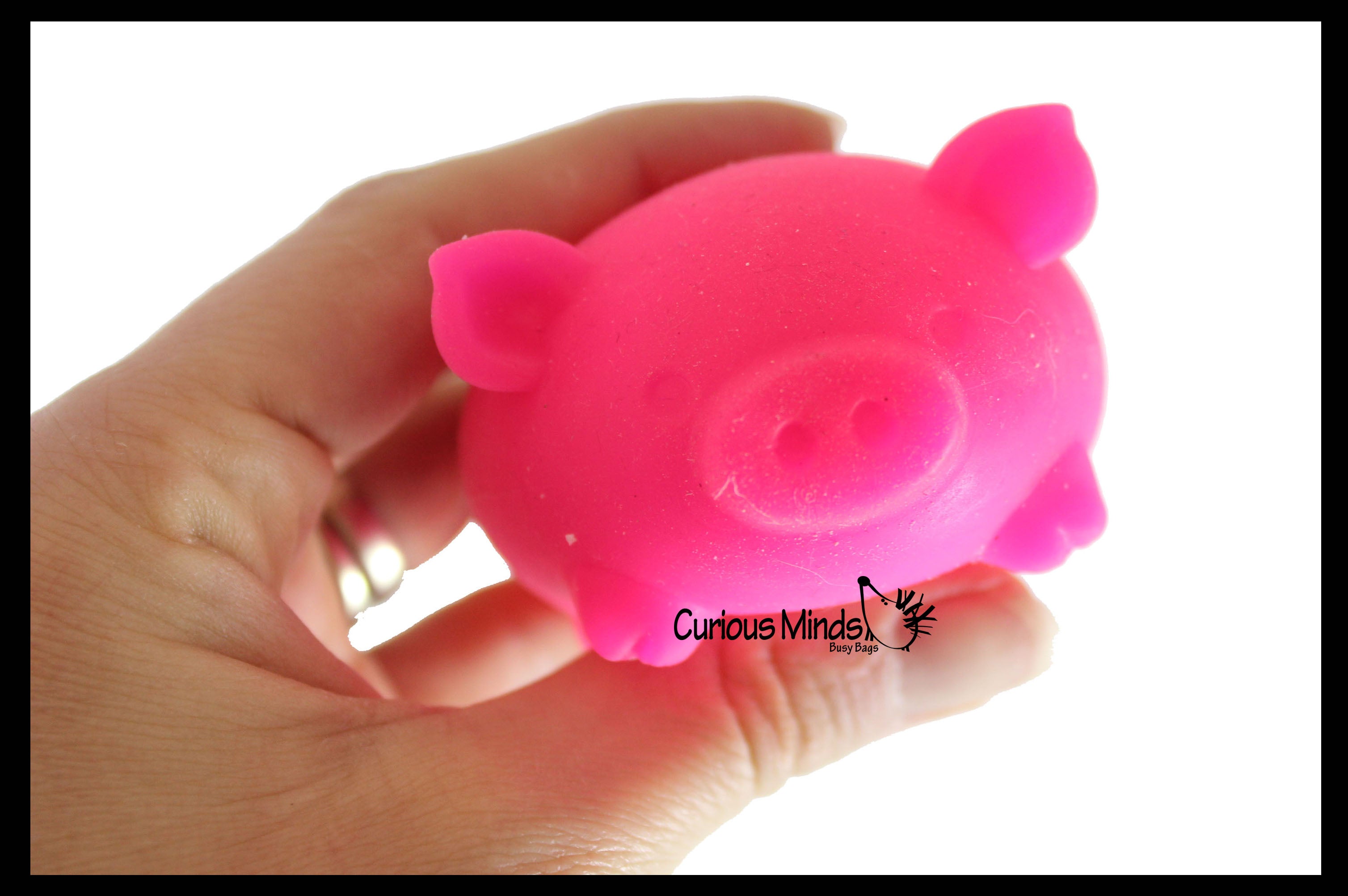 The pig shaped ball is about 3" x 2.5" x 1.75" and beyond soft. This is very calming because it has a very silky soft feel, and it is filled with a thick soft almost fluffy doh that looks like soft serve ice cream or shaving cream. You need to feel it to really know how nice these are. Comes in 4 fun colors.
