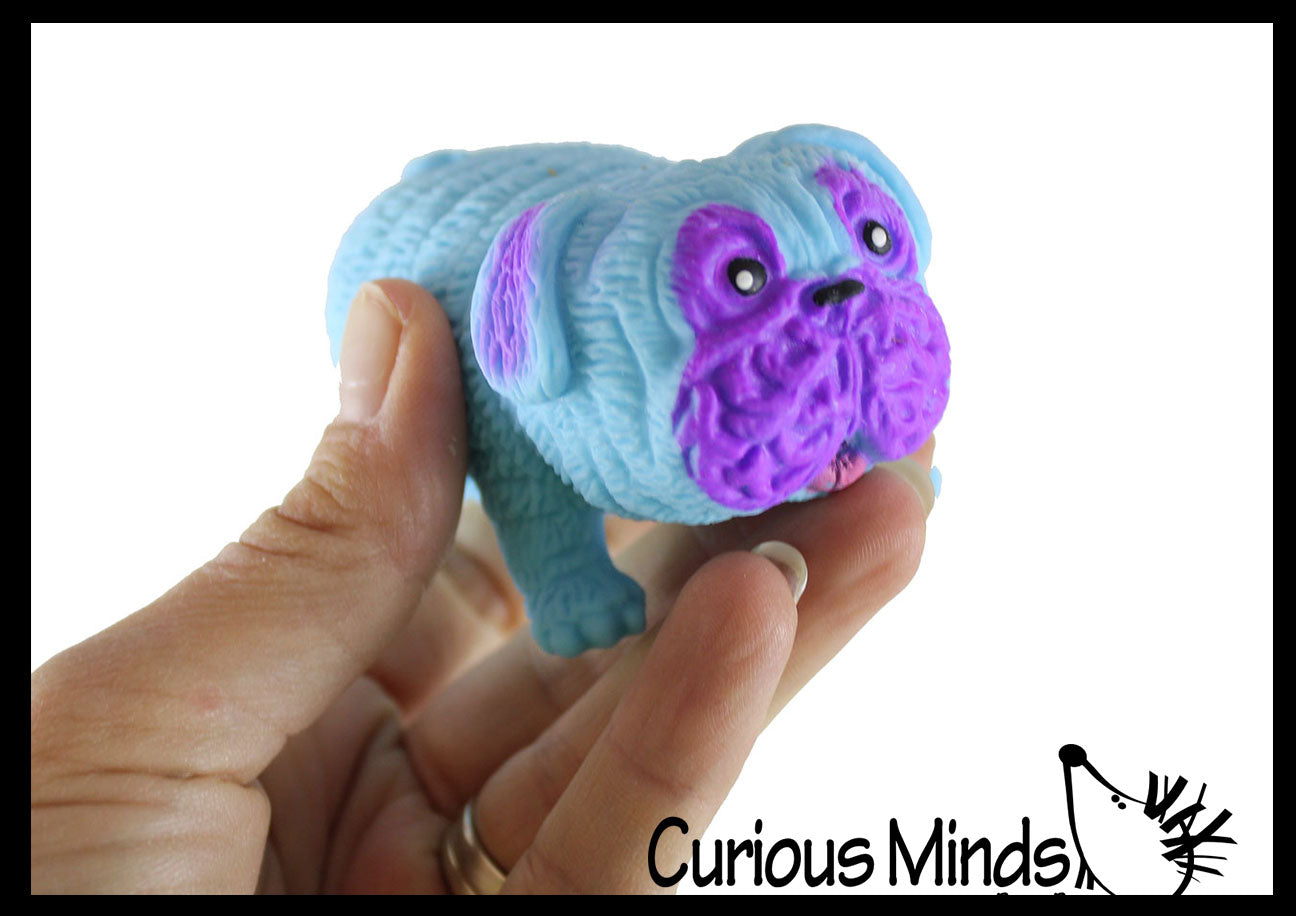 Each pup can be squeezed and stretched! This soft pug is 3.5" long x 2" tall and 1.75" thick when unstretched. (it can easily stretch up to 12"). These soft toys can be stretched far because they are thick. (within moderation of course).