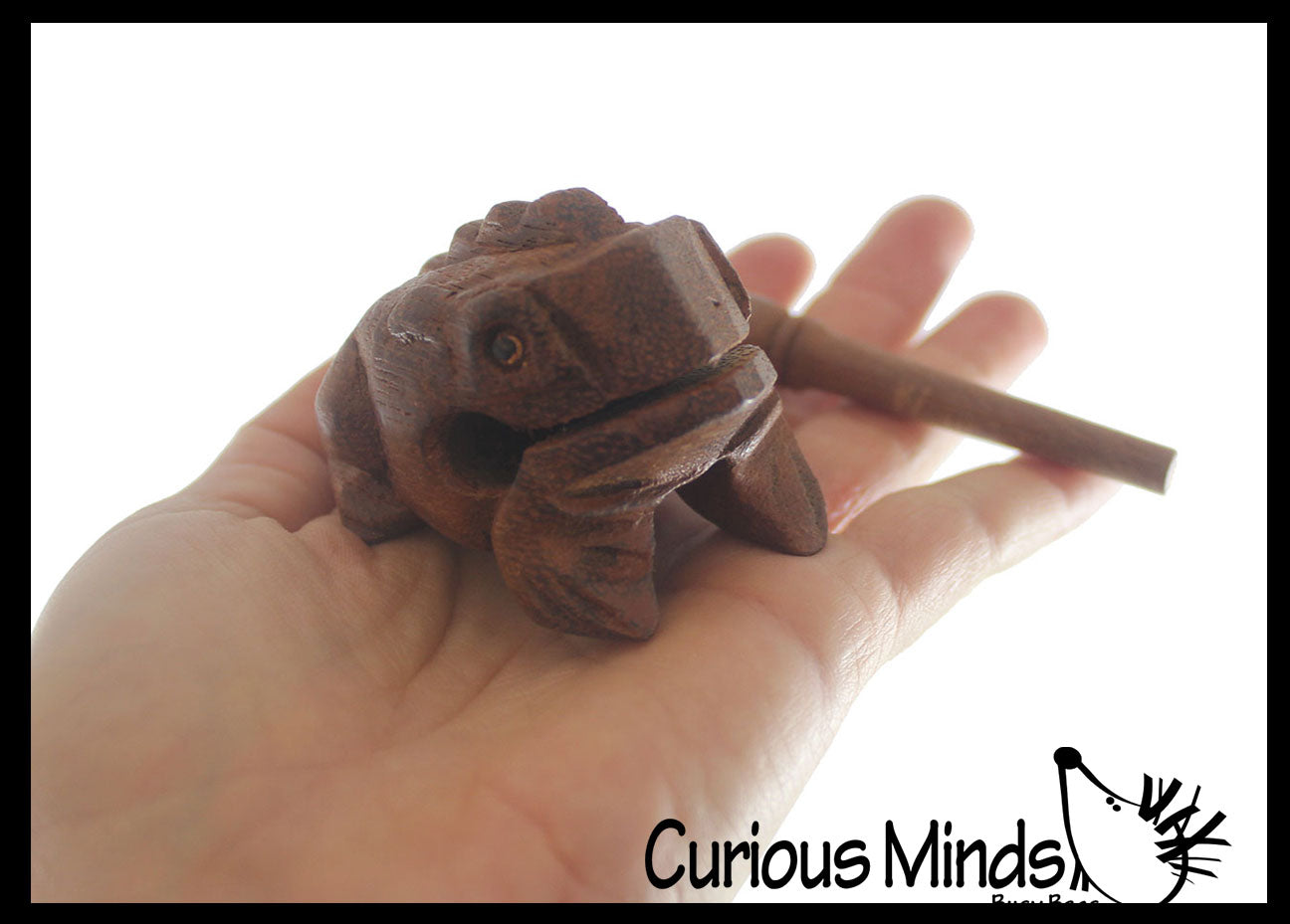 This is a cute frog shaped mini drum set toy. The wooden frog measures 2.5" x 2.75" x 1.75". The toy has one wooden stick measuring 3.5". The frog has bumps on his back so you can rub the stick over them, and pound the stick on him for different sounds. The mouth acts as a stick holder.