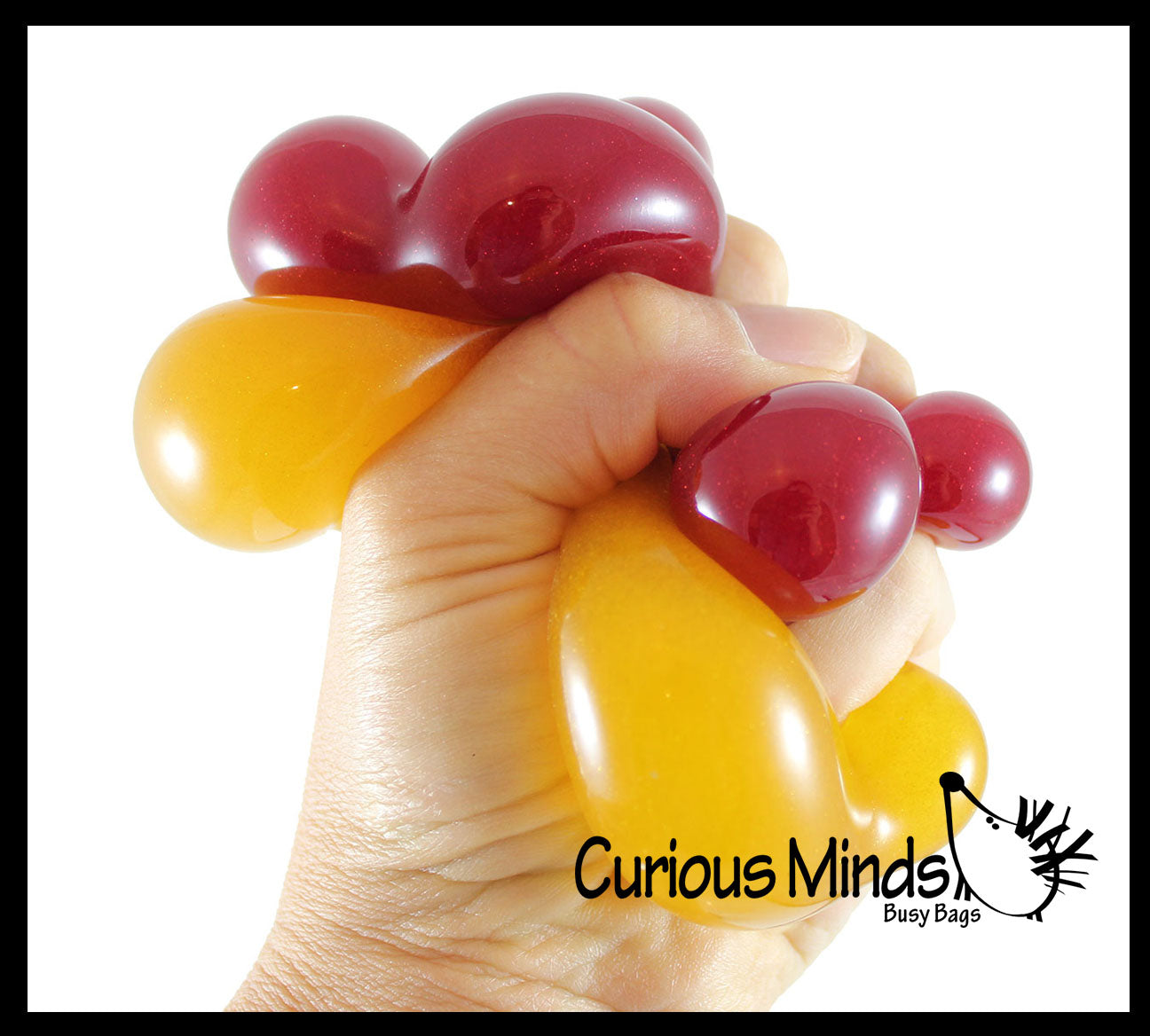 These little 2" stress balls are so fun and unique. The balls have a soft flexible clear skin and are filled with a thick gel-like filling that contains metallic glitter. The gel inside is super thick which causes the ball to slowly go back to its shape after being squeezed. Balls are individually wrapped and come in 4 fun colors. These balls have a sticky tacky surface that fades with use. Fun sensory squeezy, squishy stress ball is perfect for the office or classroom.